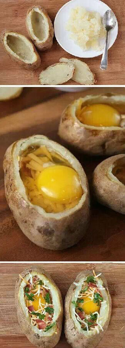 土豆洗净蒸熟,挖空后塞点蔬菜培根之类的,打入一个鸡蛋,放入烤箱烤熟!