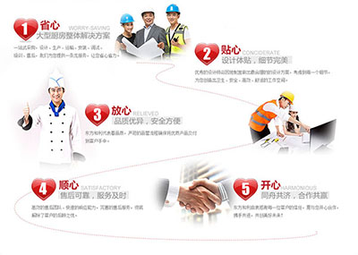 作为中钞信达的商用厨具供应商,沈阳东方和利厨业有限公司把最终成为"高端厨房工程服务专家"作为自己的事业目标。东方和利以客户为中心,采用"五心"服务体系保障全程,为客户提供厨房设计咨询、设备生产、运输、安装、调试、培训、售后等全套服务,让客户体验到管家式服务的周到与便利。